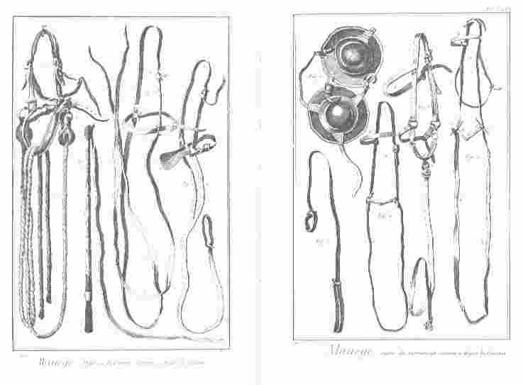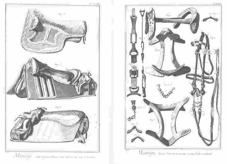 - Bild rechts: Porte-Etrieres nouveaux, Arcons, Bride et Details- Neue Steigbügelhalter, Sattelbaum, Zaum und Einzelteile