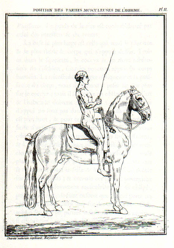 Son poing droit fort proche du gauche d'environ quatre ou cinq doigts, duquel il tient la houssine par le manche tout cachè dedans, & la pointe droite vers le Ciel, un peux panchèe vers l'oreille gauche du cheval. in der rechten Faust hält er nahe der linken den Griff der Gerte mit vier oder fünf Fingern umschlossen, die Spitze aufrecht zum Himmel, ein wenig gegen das linke Ohr des Pferdes geneigt. | He should have a slender switch in his right hand, not too long, like a fishing rod, not to short, like a bodkin; but rather short than long, because there are many useful aids with a short one. that an long one won't admit of. The handle of it ought to be a little beyond the hand, not only for the sake of caressing the horse with it, but likewise to hold it the faster. The right hand, that holds the switch, ought to advance a little before the bridle-hand, with the small end of the switch pointing towards the inside. | La Gaule et une Baguette de bouleau que le Cavalier tient dans la main droite: elle ne doit etre longue que d'environ trois pieds & demi; car si elle l'ètoit davantage, ce seroit le milieu qui apliqueroit sur les épaules, & ce doit etre la pointe de la gaule: elle donne beaucoup de grace à un Cavalier quand il fait bien s'en servier; & réprésente aussi de quelle maniere il doit tenir son épée à cheval. |