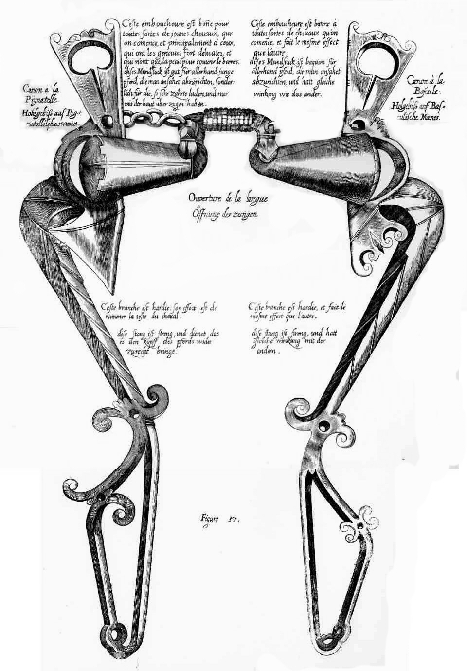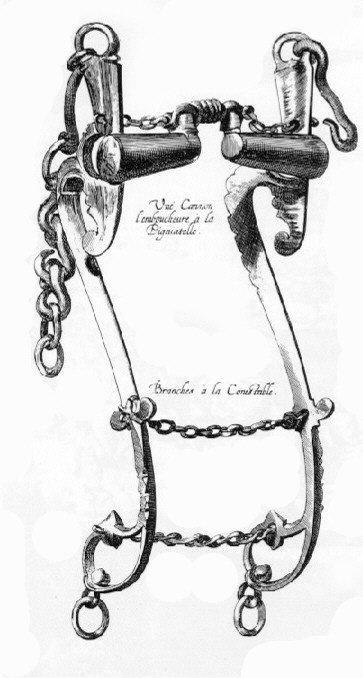 Das beste Mundstück so man bekommen mag/ ist das/ so dem Gaul im Mund nicht wehe thut/ wann es durch gute Hand deß Reuters geführet wird/ durch hülf guter Schulen/ so man ihm gibt. Dann daß etliche sich bereden lassen/ der Zaum sei es allein/ der dem Pferd das Haupt gewiss mache/ daß solches zurück gehe und sich wende nach dem Belieben deß Reuters/ ist ein närrisch ungereimte Meinung. Denn gleich wie der Unterscheid der Sporen sie seyen scharff oder stumpff/ nicht machet/ daß sich ein Pferd tummelt/ wann sie nit einer/ der derselen rechten Gebrauch weiß/ an den Fersen hat: Also kann der Unterscheid der Zäum und Gebiss für sich selbst des Pferds Haupt und Mund nicht accommodiren/ wann nicht nicht ein geschickte und in diesem Spiel erfahren Hand dazu kommet. Doch ist es auch ein Nottdurfft/ in diesem Stück dem Pferd soviel zu lieb und gefallen zu tun/ als immer möglich/ weil ausser allem Zweifel/ das Munstücker sind/ die einem Pferd wohl/ dem anderen gar nicht dienen/ und die an statt daß sie dem Mund angenehm seyn sollten/ demselben nur Unlust und Widerwillen bringen. It is neither a good saddle nor good stirrups that make a complete horse, any more than a pair of good spurs put upon the heels of an ignorant person. Neither is it a good bridle that breaks the horse well. For if they were made tractable by this piece of iron put in their mouths, the bit-maker would be the best horse-men in the world. Thus if a book put into the hand of a boy would teach him to read without instruction, we should have nothing to do but give him a good and numerous library, to make him in a moment the most learned person in the universe. But it is in good lessons, well applied to the nature, spirits, and strength of every horse, that the great and subtile science of Horsemanship consists, that science can manage a horse with only a piece of wood in his mouth. The bridle , I confess, is of some use, tho' but little; art avails much more, as all Your exellent riders well know; for I have managed a horse with a halter only, and he went as well as with the bridle, of which I have many witnesses in this city of Antwerp, who have seen the thing: I have also managed an English one with a scarf, and made him curvet and vault very justly; so that it is not the bridle, but the art of the rider, that renders the horse tractable. Die vollständige Gebisstafel