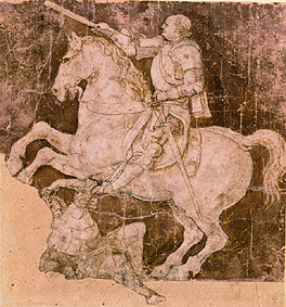 Albrecht Dürer - Ritter Tod und Teufel. Der Kupferstich wird in vielen Darstellungen der Geschichte der Reiterei als Beleg für für die Reittechnik der Renaissance gewertet. Das Bild ist meisterhaft komponiert, von großer Tiefe und Ausdruckskraft, die durch den Körper des Reiters gehende Linie dient aber der Gliederung der Bildfläche, die Reitweise dürfte Dürer kaum interessiert haben. Ebenso scheint er sich mit der Anatomie des Pferdes nicht sehr beschäftigt zu haben, wie die misslungene Darstellung der Vorhand und des zu langen Hinterbeins zeigt. Reiterbild des Antonio Pollaiolo - 1460 Ebenso Misslungen ist die Darstellung von Reiter und Pferd auf diesm Bild. Alle Details würden einen Kenner vom Kauf des Pferdes Abstand nehmen lassen, man fragt sich, wie man in diesen Sattel kommt und der Reiter scheint Probleme mit den Knien zu haben. |