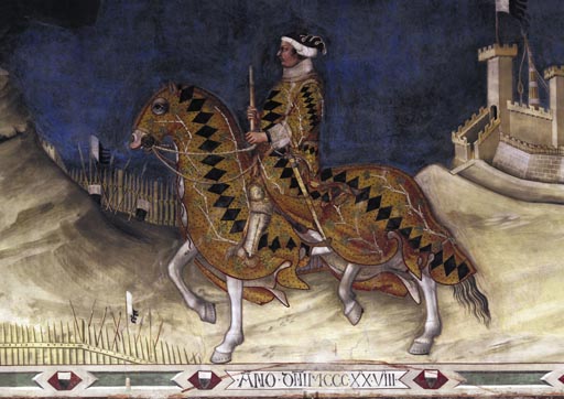 links: Jan van Eyck - Die Streiter Christi Das linke Bild des brühmten Genter Altars von 1432 zeigt ein gerittenes Pferd in schöner Aufrichtung, ein Beweis für das hohe Niveau der Reitkunst in der Renaissance. Es wird von seinem Reiter mit "falschen Zügeln" beidhändig geführt, wie es Guérinière für Pferde empfielt, die sich noch in der Ausbildung befinden. ![]() Das Fresco aus dem Palazzo Publico in Siena von 1328 stellt einen sienesischen Heerführer dar, der es offenbar eilig hat. Der Vergleich mit den beiden Nebenbildern zeigt, dass es in der Renaissance wie zu allen Zeiten auch schwache Reiter gegeben hat, die ihr Pferd bei weggedrücktem Rücken nicht beizäumen konnten. Die Zäumung ist für schlechte Reiter geeignet. Nur die leichte Zügelhand spricht zu Gunsten des vornehmen Herren. |