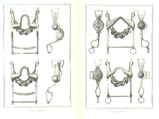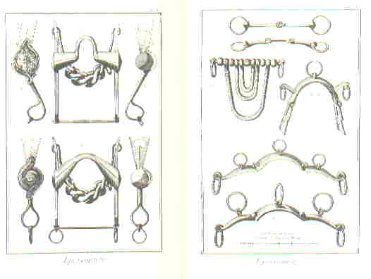 Éperonnier (Sporenmacher)L'Éperon ist mit Sporn zu übersetzen. Der "Sporenmacher" fertigte aber auch Gebisse und Steigbügel an.Auf dieser Bildtafel sind Einzelteile einer Kandarre zu erkennen. Hier und auf den weiteren Tafeln finden wir ein große Anzahl von verschiedensten Gebissen. |