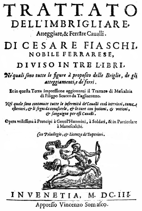Trattato del Imbrigliare, Attegiare & Ferrare Cavalli. Weitere Werke mit ähnlichem Inhalt erscheinen in kurzer Folge. Sie sind nicht Vorläufer einer aufblühenden Reitkunst sondern spiegeln den hohen Stand dieser Kunst um die Mitte des 16. Jahrhunderts in Italien. Das sie überhaupt in hunderten Exemplaren gedruckt und schnell in andere Sprachen übersetzt werden zeigt, dass in ganz Europa ein vielversprechender Markt vorhanden war. Fiaschi versucht, eine enge Verbindung zwischen Reitkunst und Musik herzustellen. Er durfte zu seiner Zeit mit musikalisch gebildeten Lesern rechnen, die seine Notenbeispiele verstehen konnten. Die vielfältigen Gebissformen erweisen sich alle als Pellham, eine ungebrochene Kandare kennt er wie auch Grisone nicht. Originaltext |