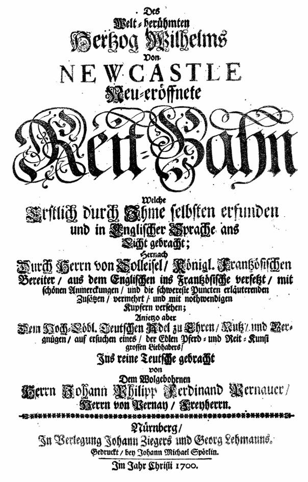 Newcastles " A General System of Horsmanship" nur in der 1743 ins Englische übersetzten französischen Urausgabe von 1658. Offensichtlich haben Autoren, die sich derart negativ über ihn geäußert haben, das Buch nicht gelesen. Tut man dies, so begegnet man einer fazinierenden, gebildeten Persönlichkeit mit überzeugendem Fachwissen, das lebendig und mit Humor vorgetragen wird. Er geht in der Pferdeausbildung keineswegs brutal, sondern konsequent nach der heute als operantes Konditionieren geläufigen Methode vor.William Cavendish, Earl, Marquis and Duke of Newcastle war eine bedeutende Persöhnlichkeit im England zur Zeit von Charles I. Er war ein gebildeter Mann, der sich für Philosophie, Kunst und Musik interessierte, war Freund und Förderer bedeutender Persöhnlichkeiten wie Descartes, Hobbs,Jonson und Dryden und veröffentlichte selbst Gedichte und Dramen. In den Unruhen der Revolution kommandierte er die Nordarmee, musste aber 1644 nach Cromwells Sieg England verlassen. Er ließ sich in Antwerpen nieder und mietete ein Haus von Rubens Witwe. Von nun an widmete er sich der Reitkunst, begann mit der Niederschrift seiner Methoden und beauftragte den Maler Abraham van Diepenbeke mit den Illustrationen. 1665 nach dem Sieg von Charles II, dessen Erzieher und persöhnlicher Ratgeber er war, kehrte er nach England zurück und wurde wieder Duke of Newcastle, widmete sich aber weiter der Pferdeausbildung bis zu seinem Tod 1676. Seine Texte sind etwas ungeordnet und enthalten viele Wiederholungen, sie treffen aber immer ins Schwarze. Dabei zieht er häufig originelle und witzige Vergleiche zur Verdeutlichung seiner Thesen heran. Man erkennt den genialen Praktiker und Könner. Originaltext |